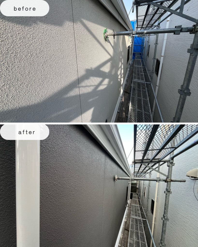 外壁を落ち着いた濃色で仕上げることで、重厚感と高級感のある外観へと生まれ変わりました。 デザイン性だけでなく、耐久性・遮熱性・防水性を兼ね備えた高性能な外壁塗装・屋根塗装工事となりました。