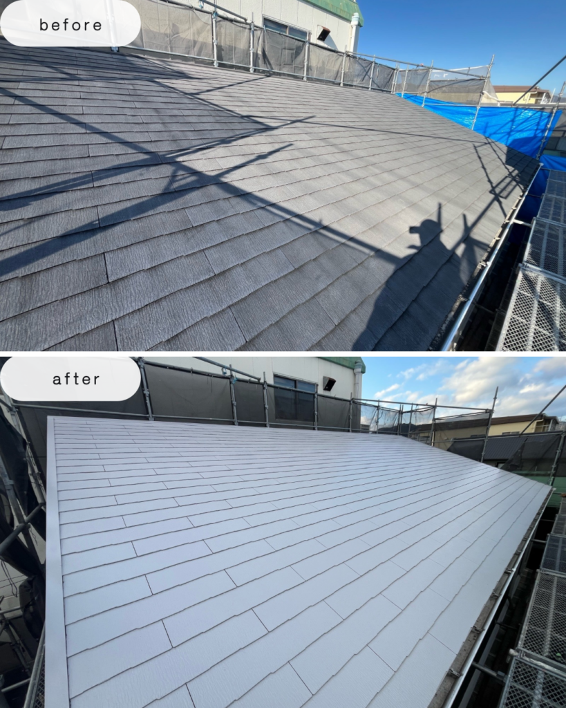 屋根にはフッ素系遮熱塗料「スーパー遮熱サーモF」を使用しました。 高い遮熱性能により屋根表面温度の上昇を抑え、夏場の室内温度上昇を軽減します。