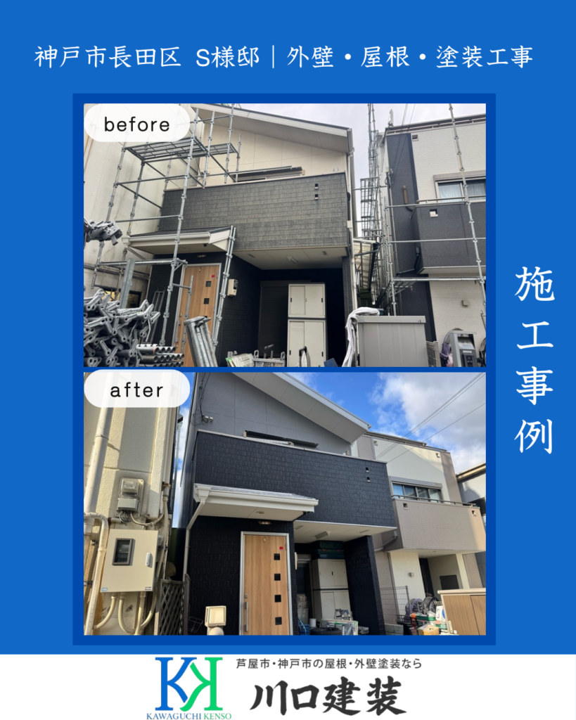 神戸市長田区にて戸建て住宅の外壁塗装・屋根塗装工事を行いました。 経年劣化による色あせ、チョーキング現象、防水性の低下が見られたため、 高耐久・高性能塗料を使用し、建物の美観と耐久性を向上させました。