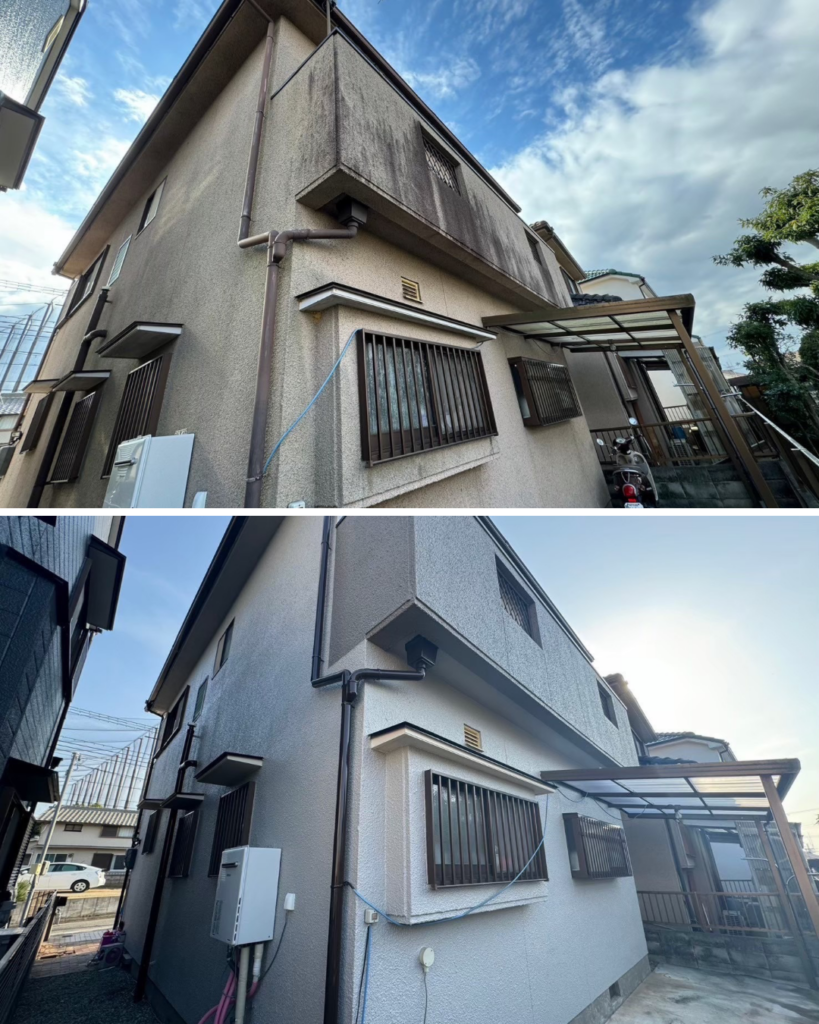 施工前は白系の外壁で明るい印象のお住まいでしたが、経年劣化によるくすみや雨だれ跡が見受けられ、全体的にやや古びた印象となっていました。